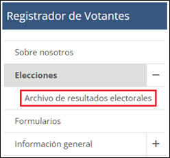 - Visit eel sitio web del Registro de Votantes, SoCoVotes.com. Haga clic en la opcón “Elecciones” cerca de la parte superior del menu a la izquiera, y luego haga clic en la subopción “Archivo de resultados electorales” que aparece bajo “Elecciones” (ver recuadro rojo abajo).