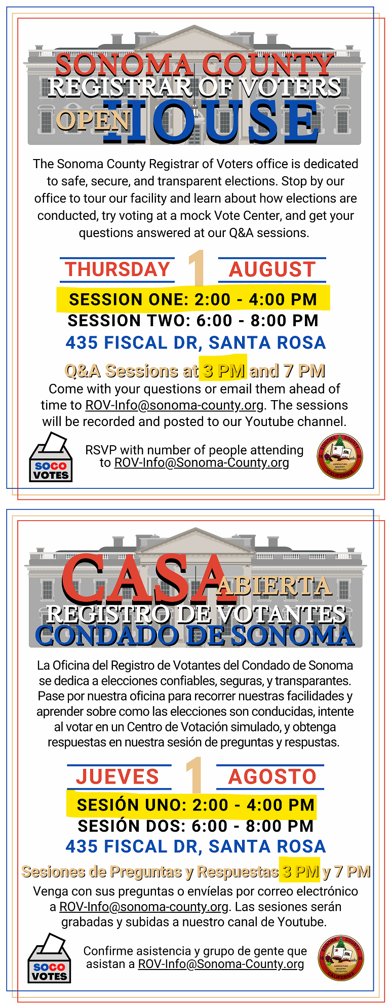 Anyone interested in attending the Open House is encouraged (but not required) to RSVP by email to rov-info@sonomacounty.gov or by calling (707) 565-6800 (Toll-Free: [800] 750-VOTE [8683]; TDD: [800] 565-6888). If possible, please state which session you plan to attend and the number of guests you will be bringing.